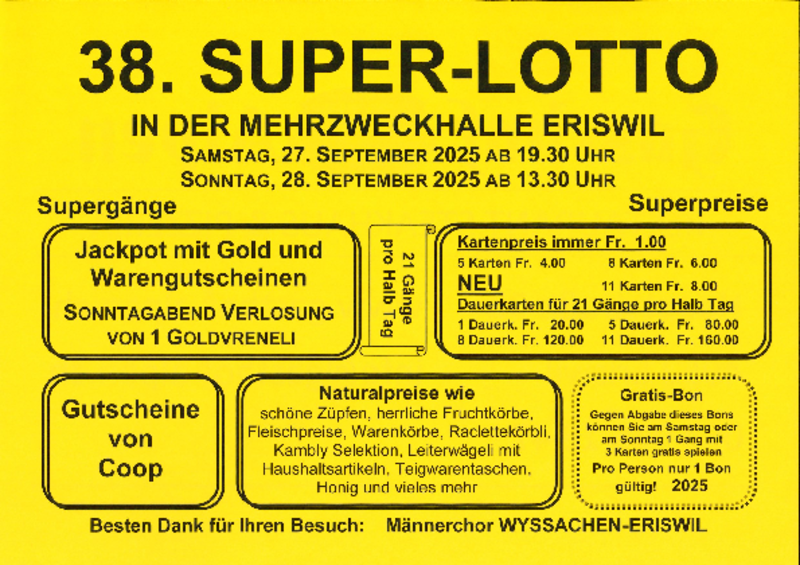 Super-LottoSamstag 27. September, ab 19.30 UhrSonntag, 28. September, ab 13.30 UhrBeginn:27.09.2025 - 19:30 Uhr Ende:28.09.2025 - 19:30 UhrOrt:Mehrzweckhalle EriswilVeranstalter: Männerchor Wyssachen Eriswil ics Zurück zur Übersicht
